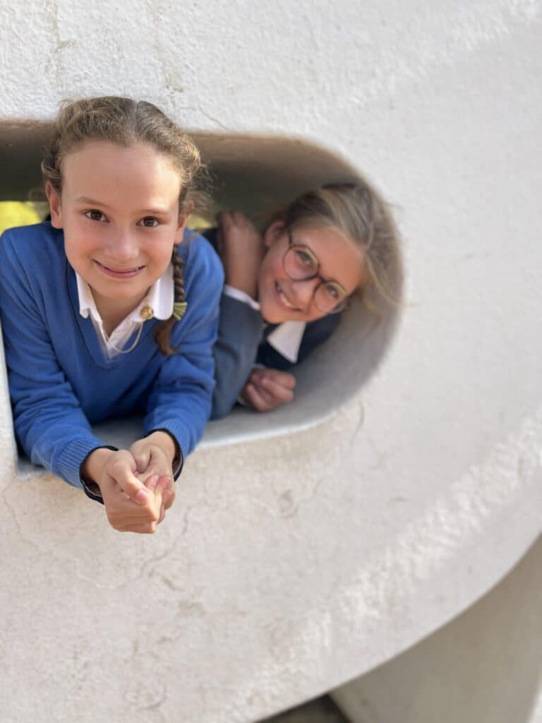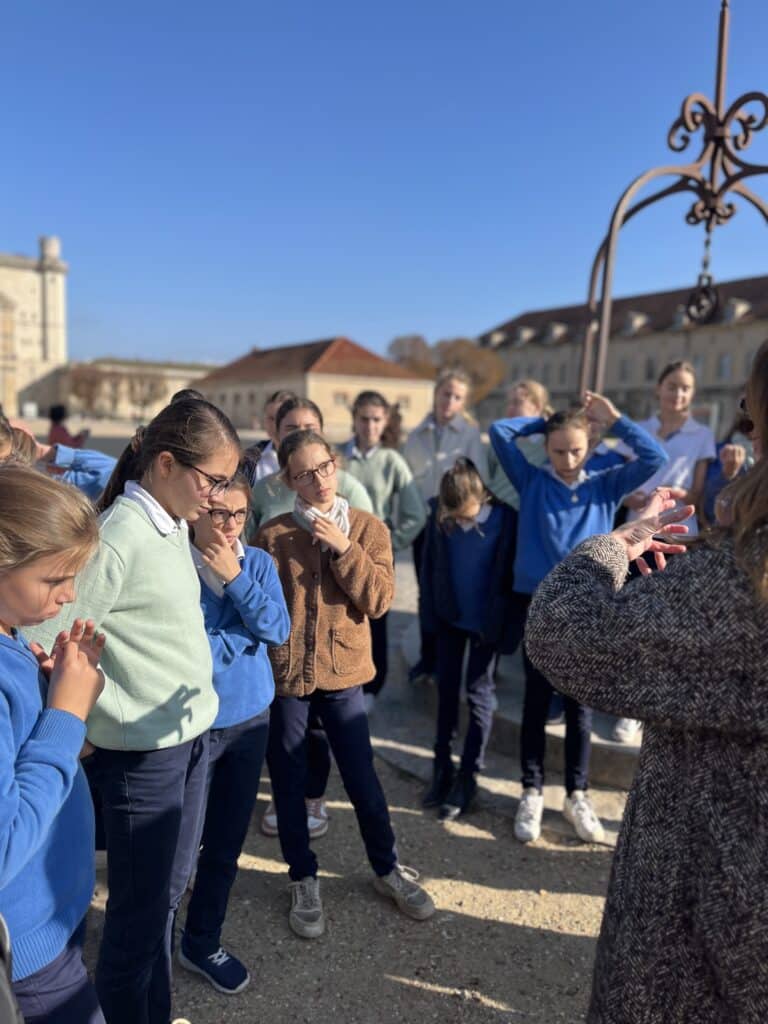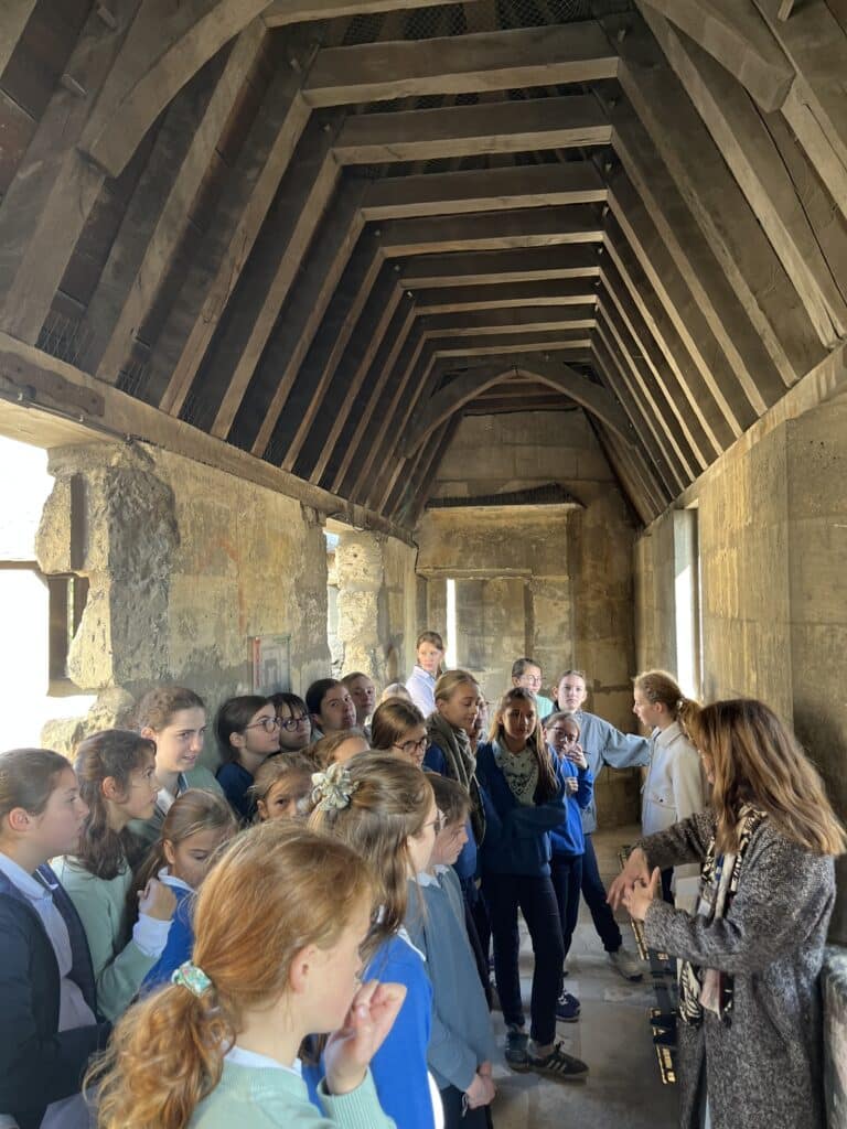 Déjà les élèves montent à l’assaut du chemin des gardes et du donjon. Elles vont de découverte en découverte : « On voyait sur les pierres les marques des tailleurs de pierre » explique Thaïs et dans une salle, un prisonnier a peint sur les murs. « Pour avoir ses peintures, une couverture, un oreillers, il fallait payer les gardes »… Elles étudient aussi la défense du château : « Les douves sont lisses en pentues », remarque Margot, tandis que Thaïs se souvient que « sur le chemin de ronde, il y avait de gros trous. On pouvait y faire passer des pierres qui s’écrasaient contre les ennemis qui voulaient se lancer à l’assaut » « Mais, ajoute Margot, le château n’a jamais été attaqué ». Elle s’étonne que des personnes aient pu vivre là il y a très longtemps : « On a l’impression de remonter le temps ». Elles sont conduites dans la chapelle. Là, une petite pièce attenante permettait au roi et à la reine de suivre la célébration.