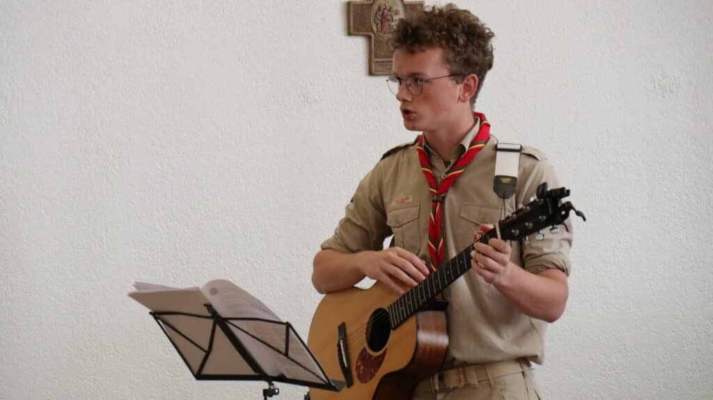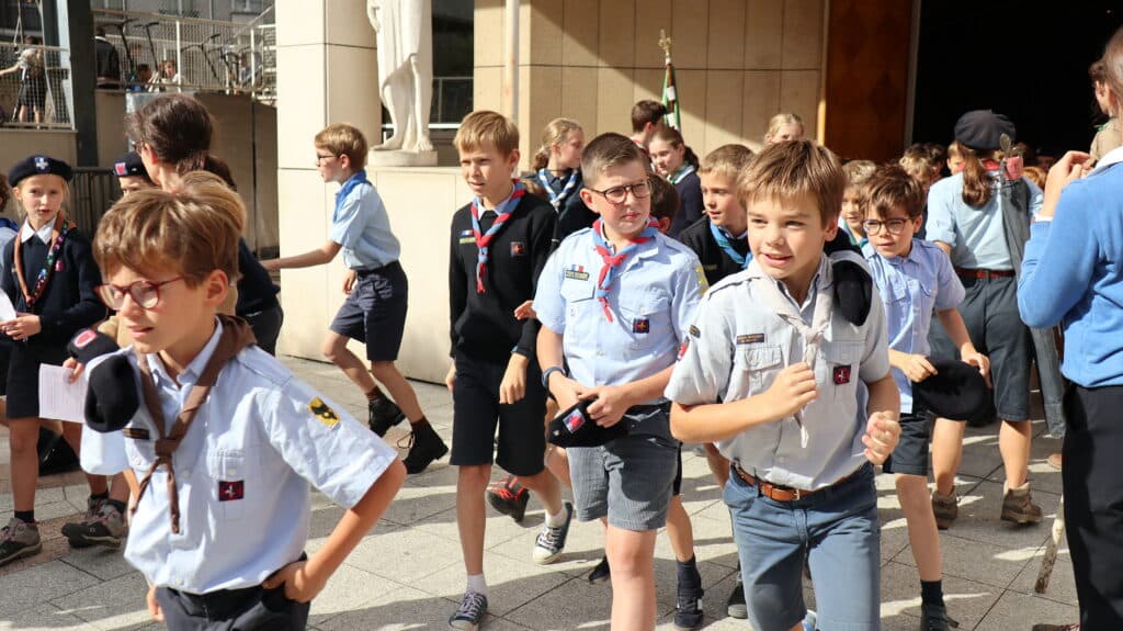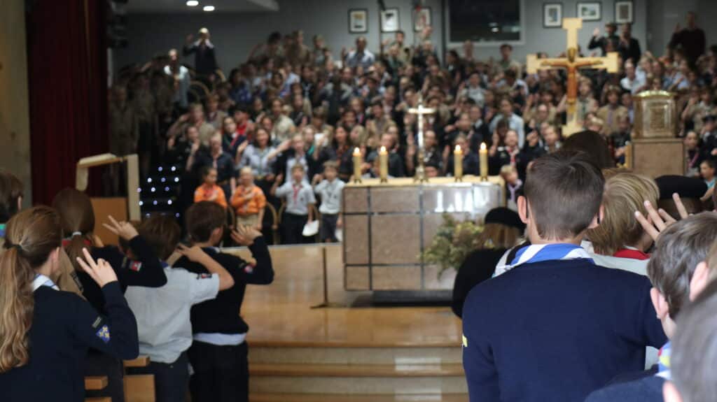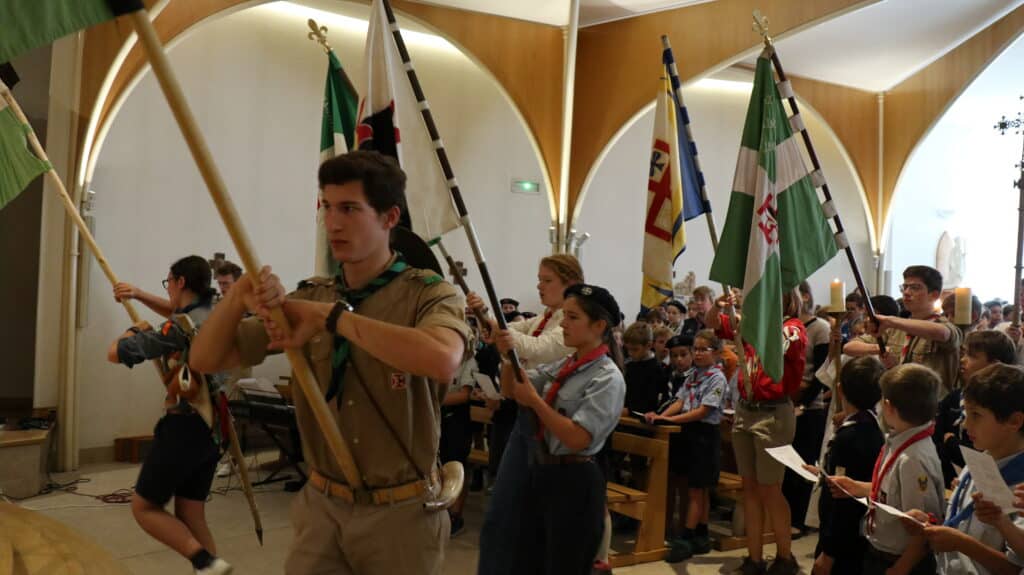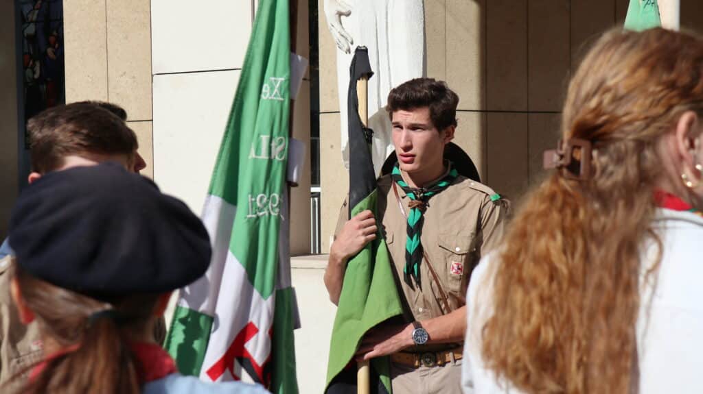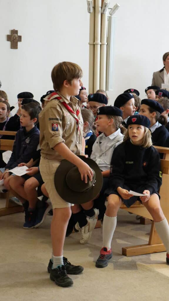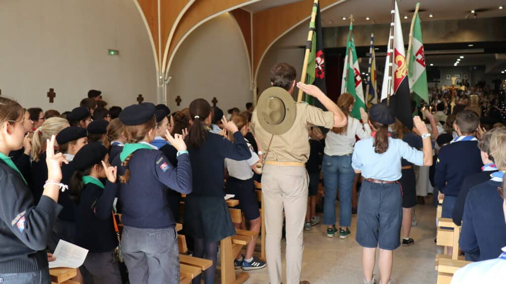 Ils sont arrivés dès le matin, fiers dans leur uniforme scout, le foulard noué autour du cou. Nos élèves étaient plus de 400, du primaire et du secondaire, à la chapelle ce jeudi 2 octobre, à l’heure du déjeuner, pour la messe. Drapeaux, bannières, étendards ont encadré cette très belle célébration présidée par l’aumônier du groupe scout de Saint-Jean, l’abbé Stéphane de Spéville, riche des couleurs de chaque mouvement : scouts d’Europe, de France, unitaires… tous mêlés dans un semblable idéal.