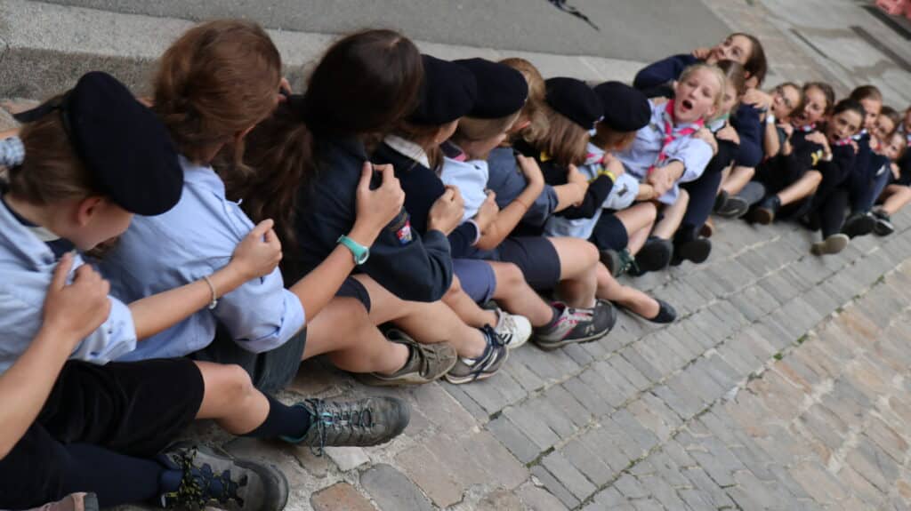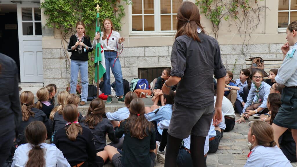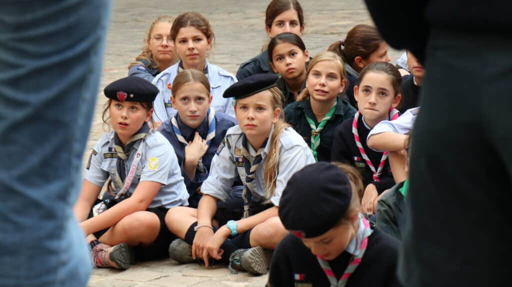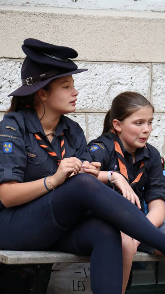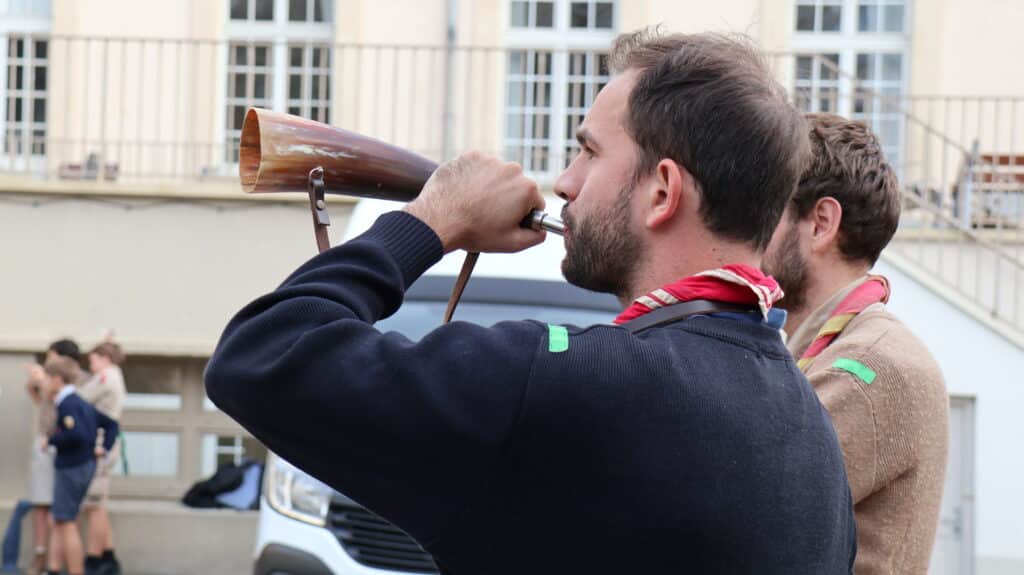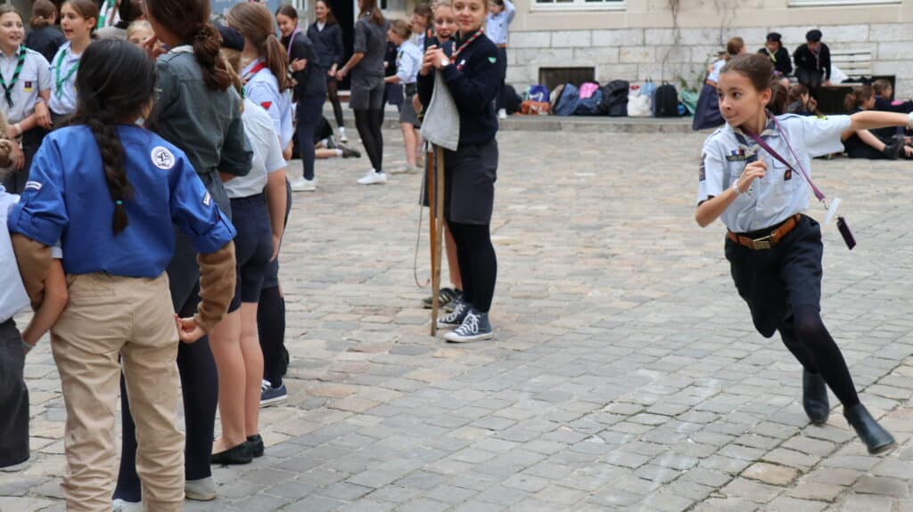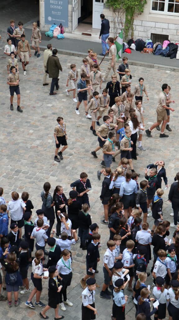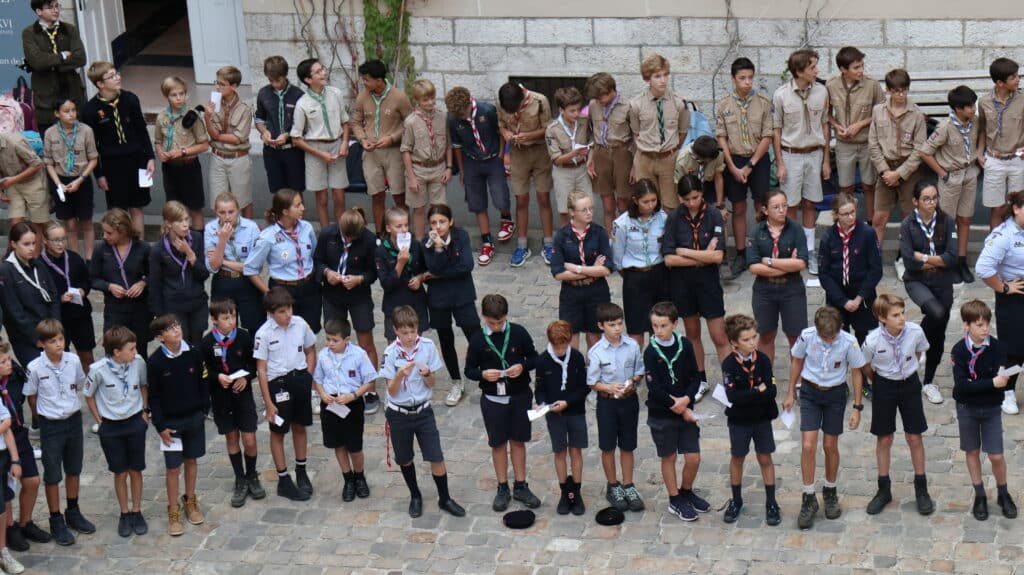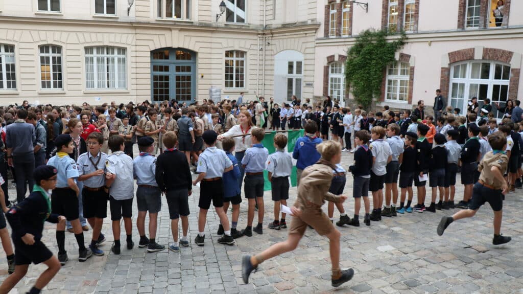 En fin d’après-midi, après les cours, les collégiens et les lycéens se sont retrouvés pour un temps de jeu animé par leurs aînés, étonnés d’être avec leurs camarades de classe, voisins de bureaux, binômes d’exposés, dans un contexte un peu différent. D’un coup, l’uniforme a changé, et les voilà, courant dans tous les sens, s’attrapant les foulards dans une joie partagée par les parents d’élèves sortant d’un rendez-vous ou un professeur quittant la classe. Il flottait dans l’air comme une impression, celle de partager à l’école quelque chose d’autre que l’école. Un ressenti qui s’est amplifié lors du « rasso » spectaculaire dans la cour d’honneur. Cette fois, ils pouvaient voir distinctement leurs ainés, alignés sur l’estrade, leur petit frère, le béret vissé sur la tête, juste en face d’eux, le camarade un peu moins apprécié peut-être, chez qui on découvre une passion partagée. Tant d’enfants et de jeunes gens qui mettent à l’honneur les valeurs du scoutisme dans ce lieu qui habituellement leur apprend les disciplines académiques. Et bientôt, la joie explose à l’annonce de la tartiflette ! La journée s’est donc achevée ainsi, par un grand repas bien animé par des chants scouts.